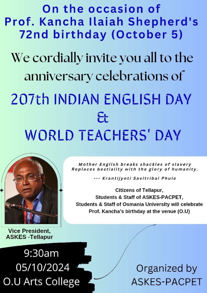 Celebrating 72nd Birthday of Prof Kancha Ilaiah as Indian English Day Share this: Click to share on X (Opens in new window) X Click to share on Facebook (Opens in new window) Facebook Like Loading... Related